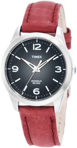 The Timex Women's Weekender Casual Rose Leather Strap Watch offers casual, yet fashionable styling for the relaxed lifestyle. The deep rose-colored strap with black sunburst dial makes this an ideal accessory for any wardrobe. The Indiglo night-light make this timepiece truly unique. The 32mm silver-toned brass case holds the dial, which is protected by a hardened mineral crystal and features Arabic hour markers at the 3, 6, 9 and 12 'o clock positions. For reliable timekeeping, the watch hands are powered by analog quartz movement.