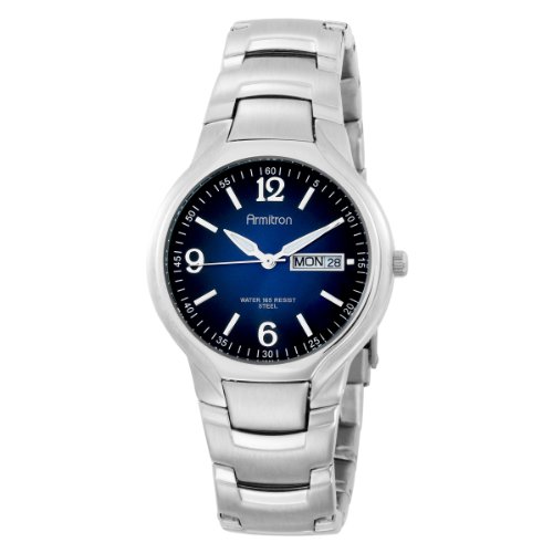 Bright features and a classy silver-tone design define the Men's Casual Silver-Tone Blue Dial Watch from Armitron. Detailed with elegant contours that extend to meet the stainless steel band, the stainless steel case backgrounds the crisp, blue dial. With a unique graded color scheme, the round dial features easy-to-read Arabic numbers at six, nine, and 12 o'clock with silver-tone bar indexes marking the remaining hours. Luminous-filled, silver-tone hands track the time, and a convenient day and date display sit just inside three o'clock. Marked with crisp, Arabic numbers every five minutes, the outside minute track helps with detailed time telling. The flexible stainless steel band is accented with uniquely designed links and fastens with an easy and secure fold-over clasp with push-button release. Water resistant to 165 feet, this modern timepiece can be worn with professional or casual wear. and then update cheapest prices immediately. Limited time Only!